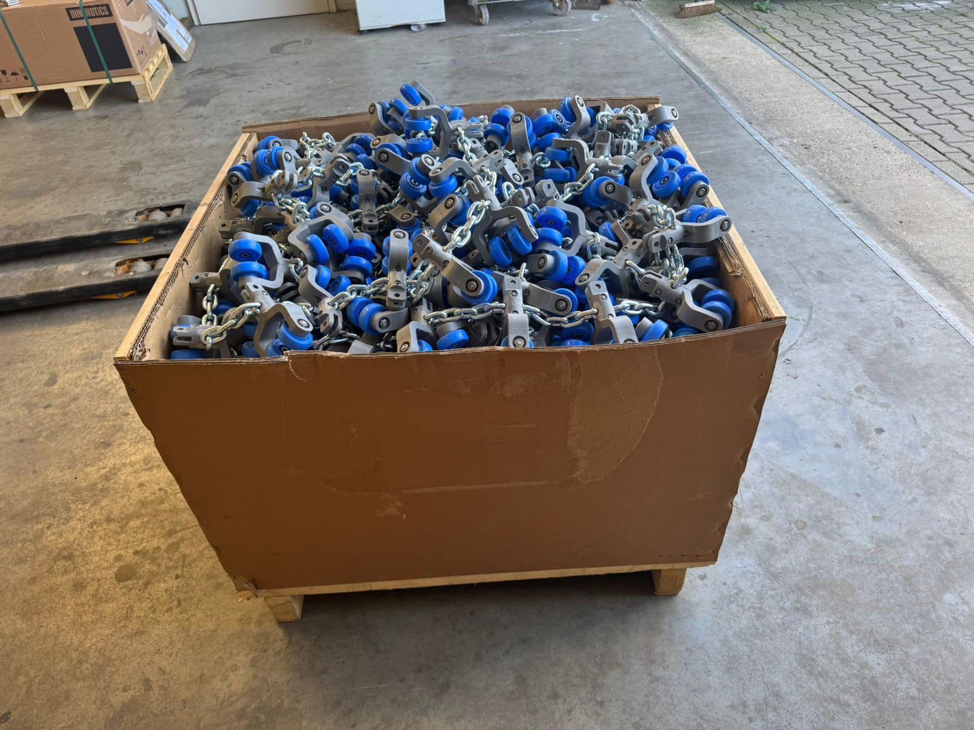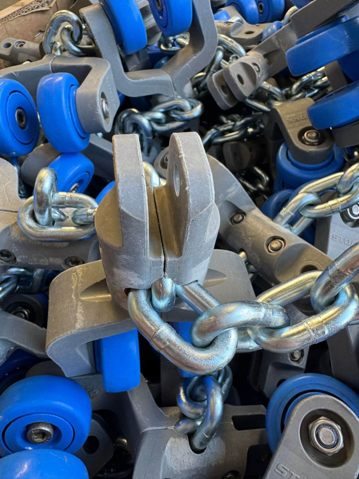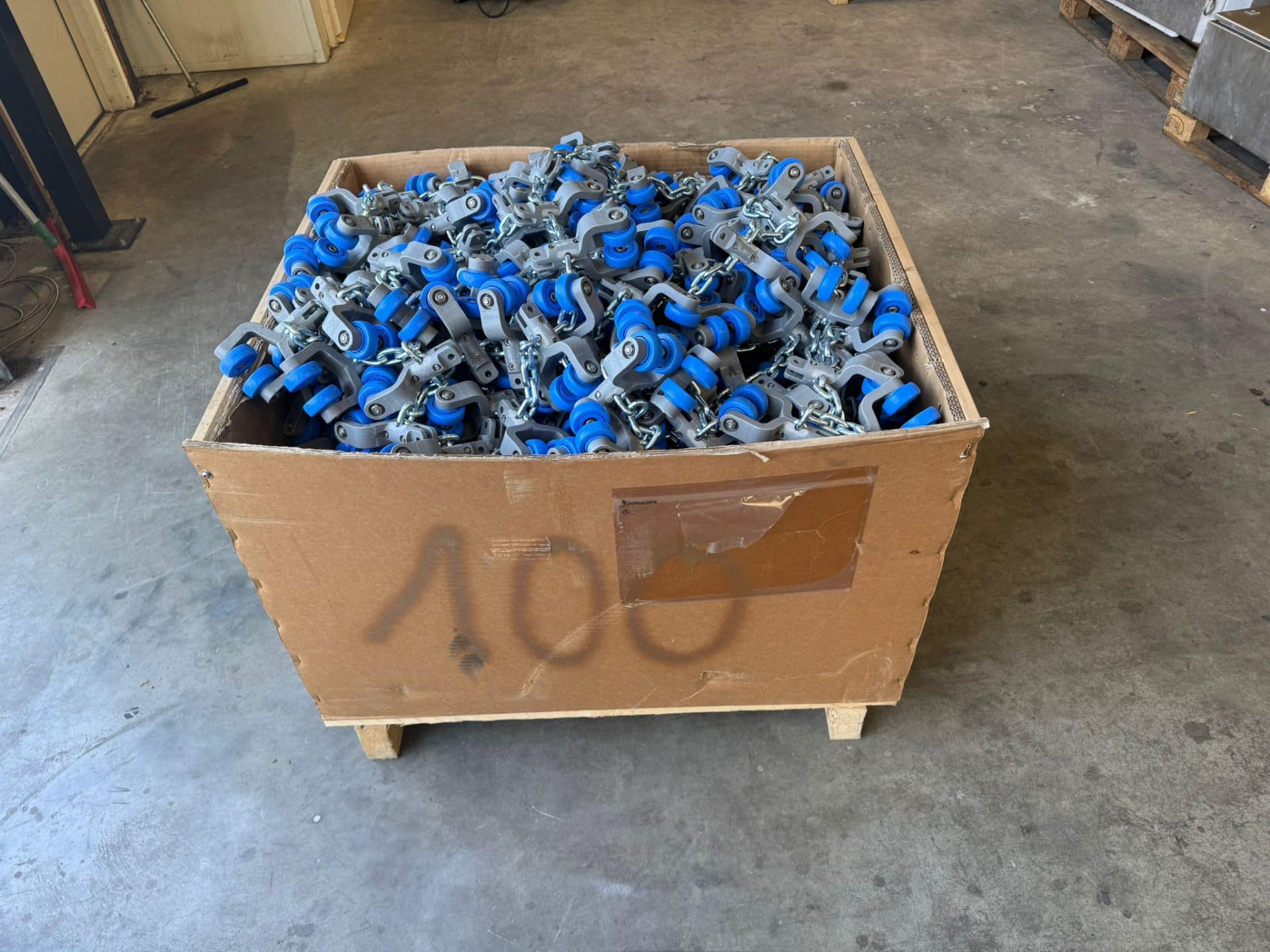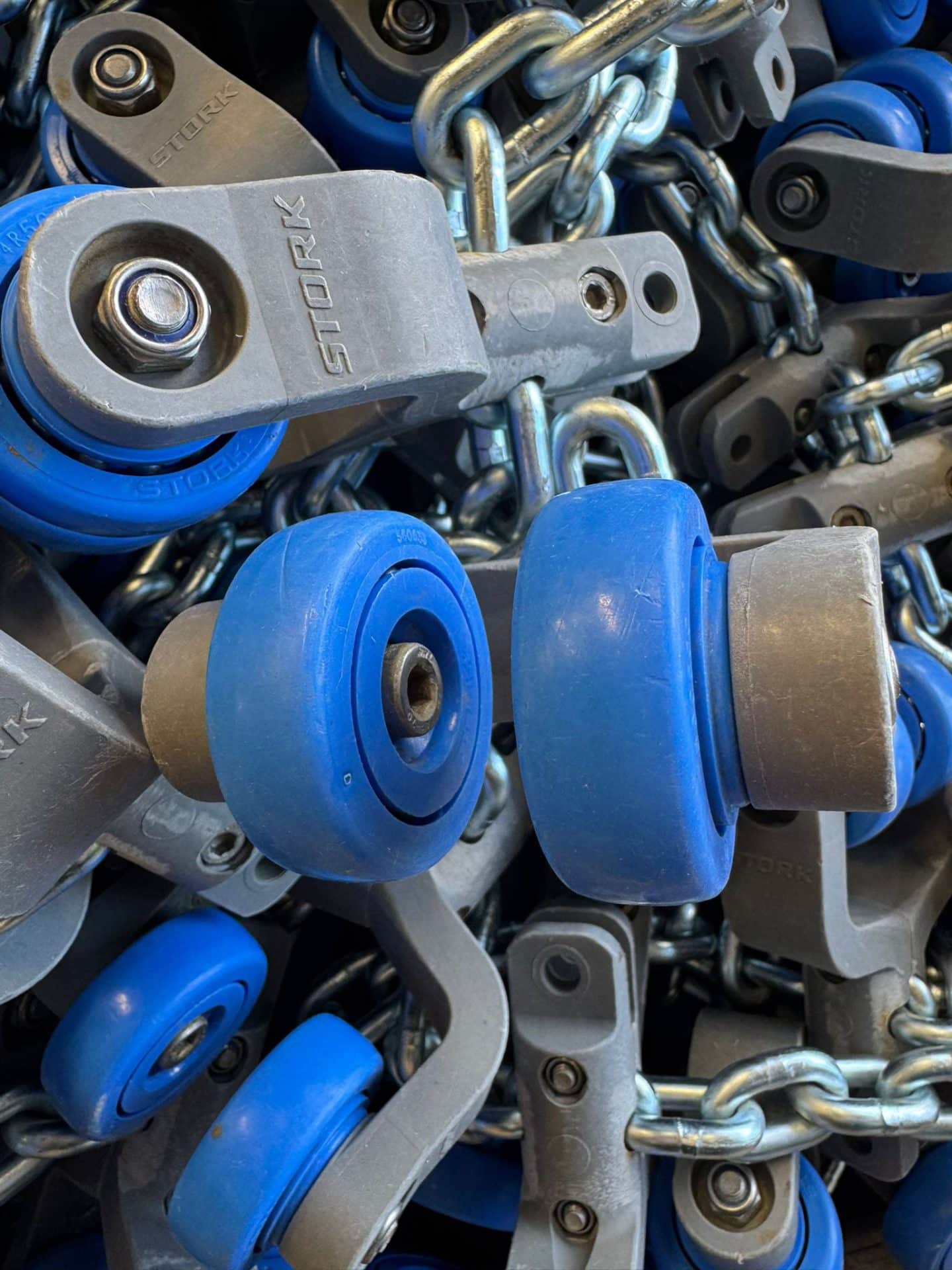 We have 1,000 metres of chain w/ trolleys, Stork, T-track, 6 for sale. This overhead conveyor is in excellent, like-new condition and has been only slightly used. If you’re interested, please contact us.